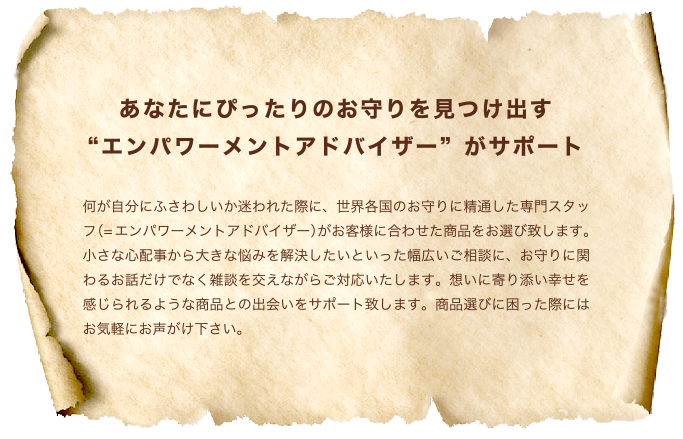 お守りを通して見えてくる異国の文化、人々の愛や神への信仰日本とは異なる居住環境、自然災害との戦いや野生動物との戯れなどその国にしかないお守りが持つストーリーを日々探求しています。