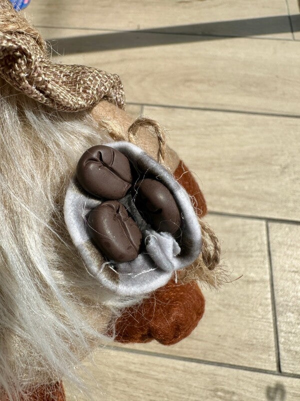 コーヒー豆の袋を抱えた姿は、まるで「今日もたくさん財宝を見つけたよ!」と自慢しているよう。お家やお店、車に飾れば、あなたのもとにもお金や富を運んでくれるかもしれません。