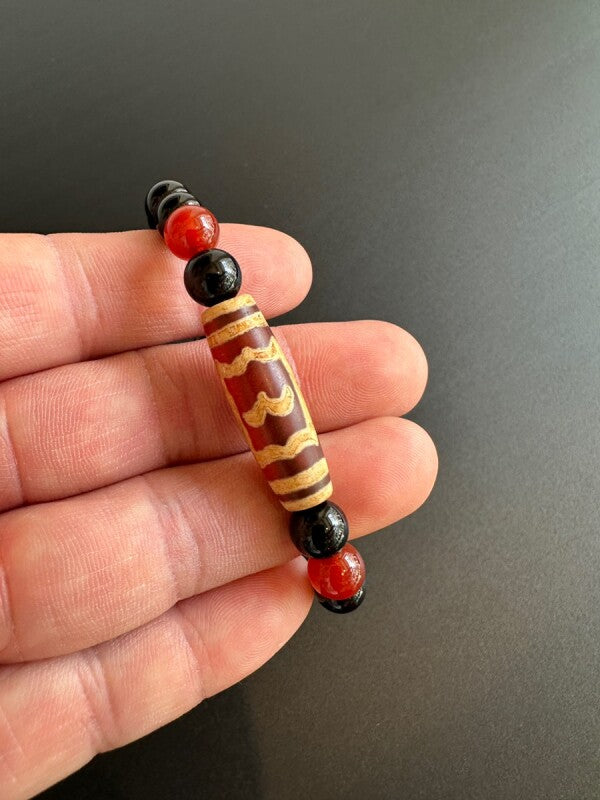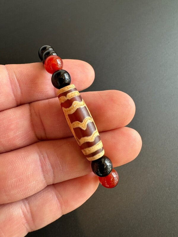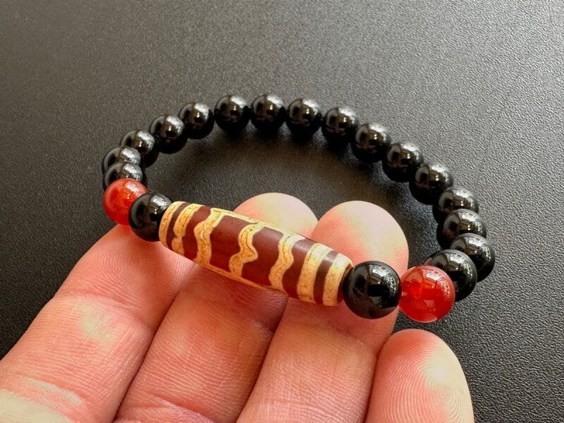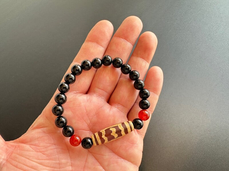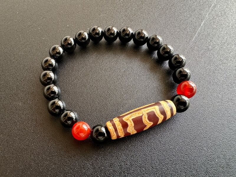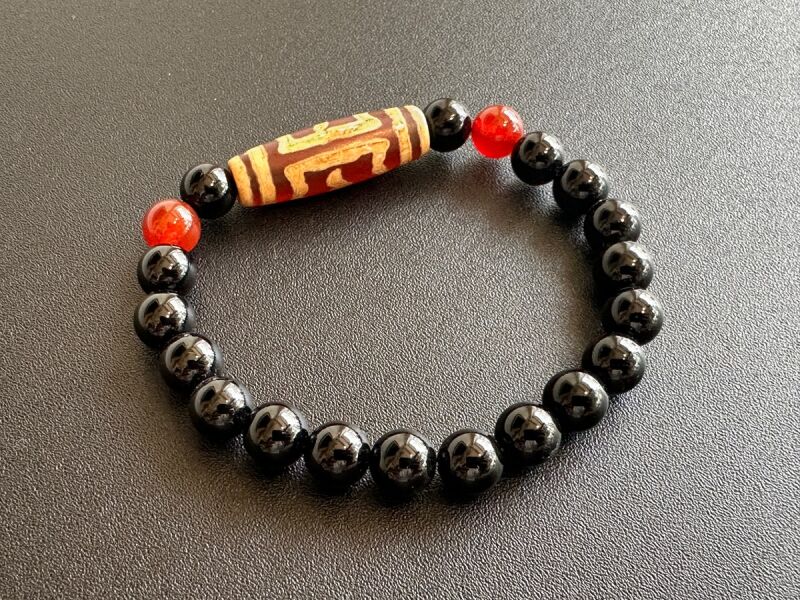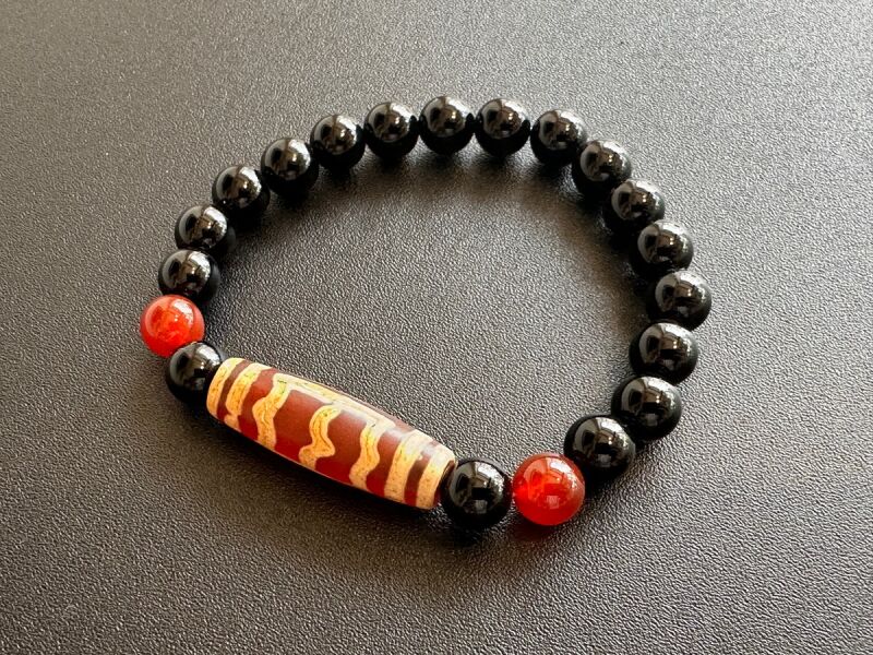 この天珠と組み合わせたのは、精神的なリラックスを促し、夢や希望を現実へと導く「オニキス」、そして富と繁栄、癒しをもたらす「瑪瑙」です。オニキスはマイナスのエネルギーを弾き、古代から災いを避けるお守りとして使われてきました。瑪瑙は心に安らぎを与え、精神的なサポートにも役立ちます。