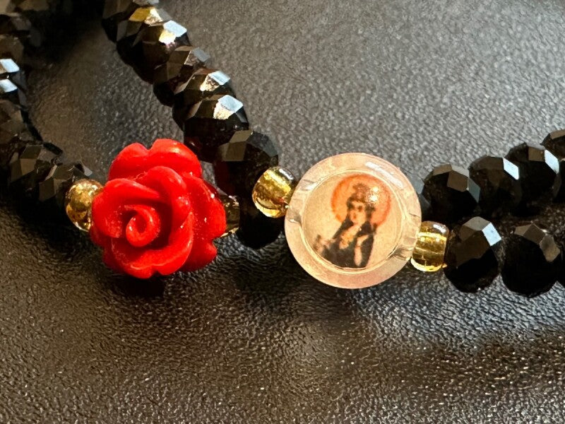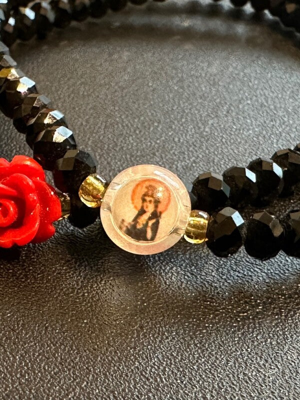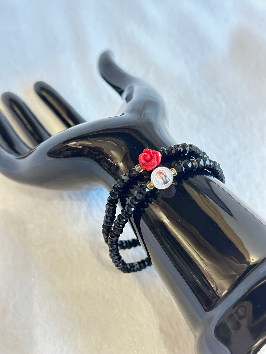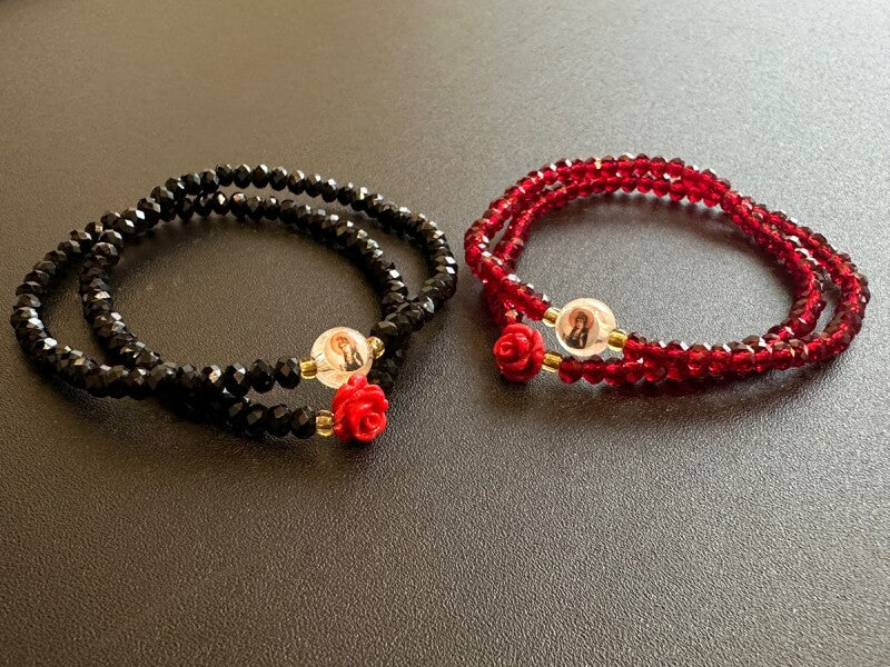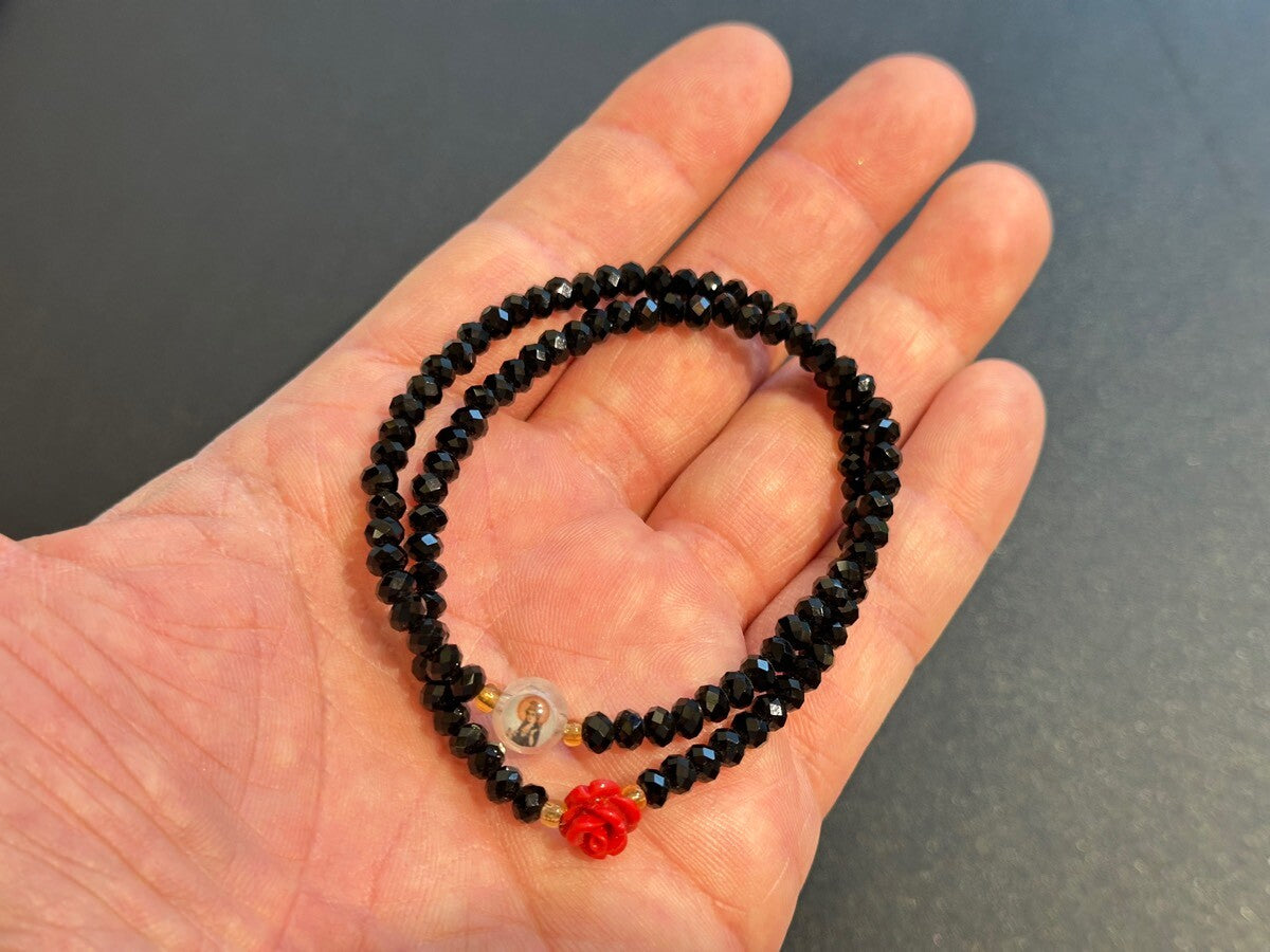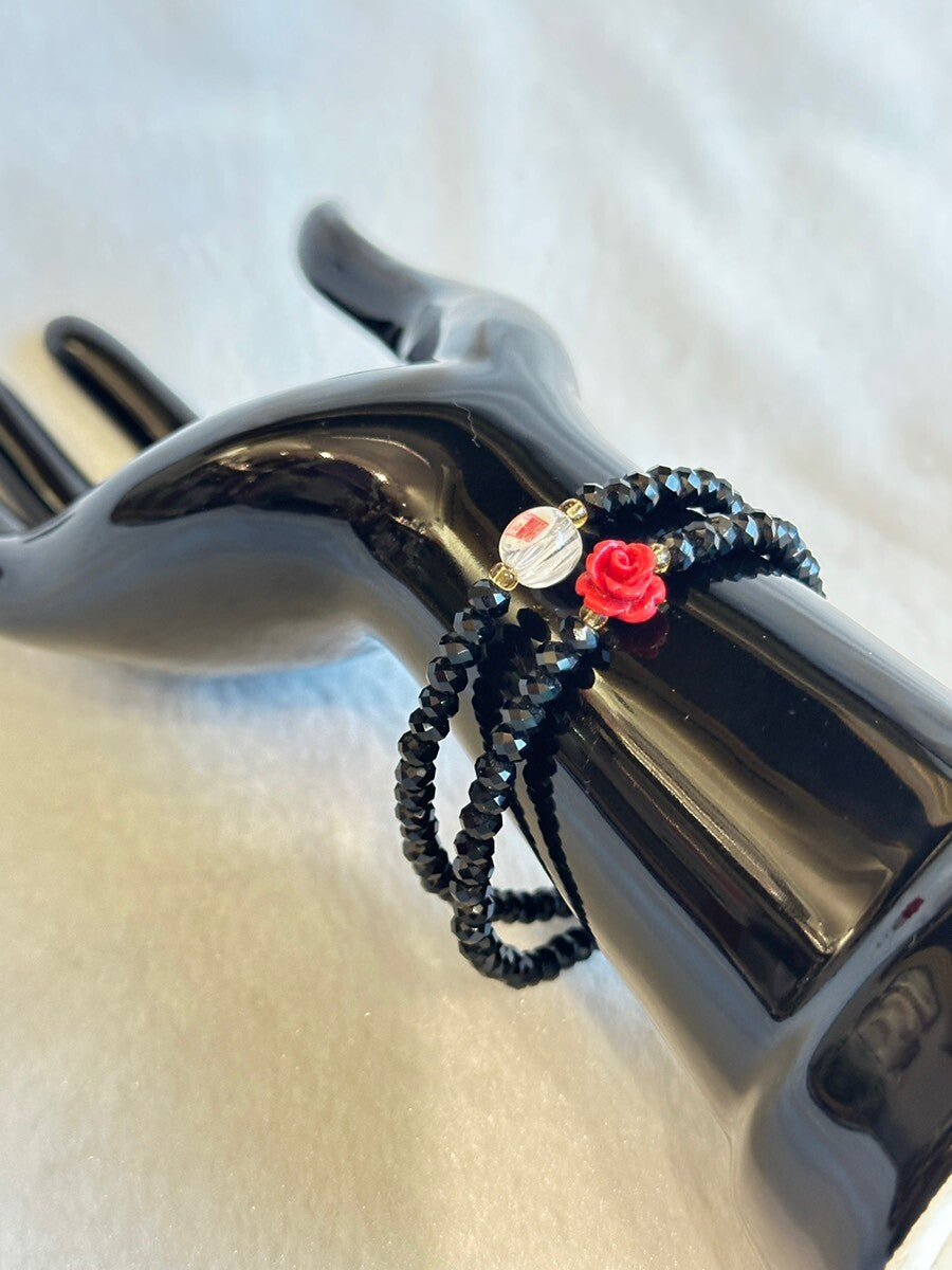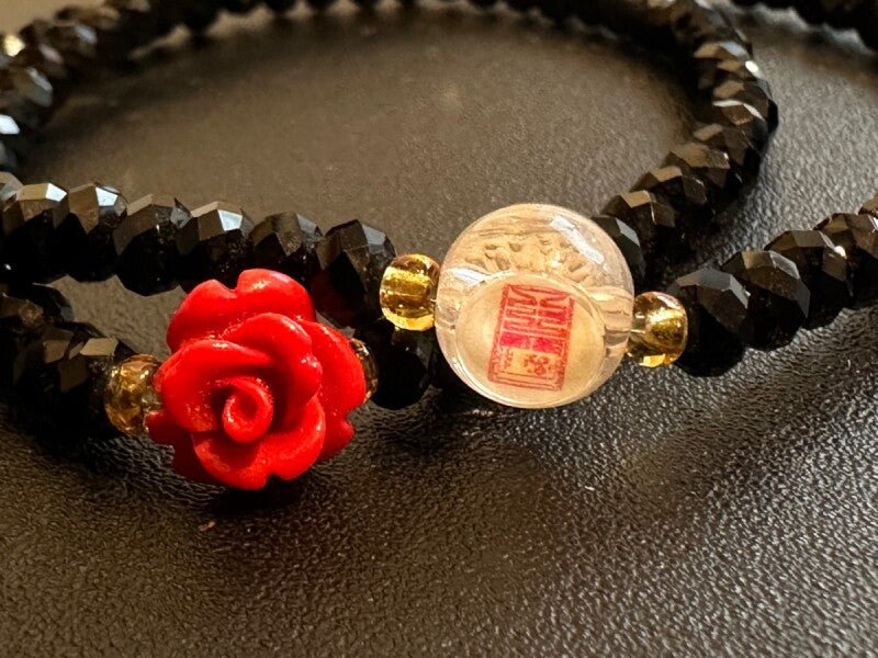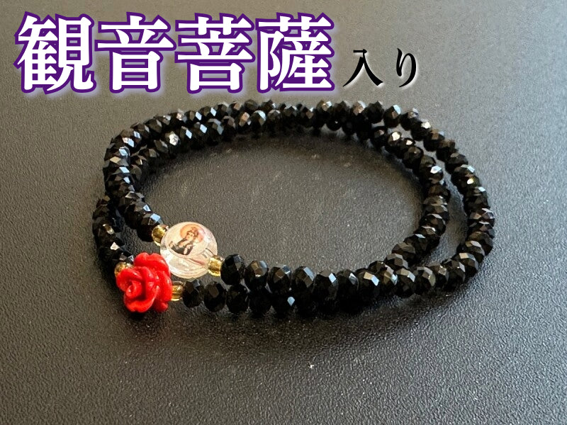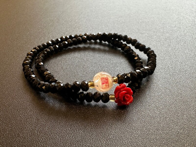 輝くオニキス(約34cm)を2連で着ける、ファッション性の高いブレスレット。韓国の観音菩薩様、幸運を招く霊符、情熱の赤い薔薇が、あなたの願望成就を力強くサポートします。