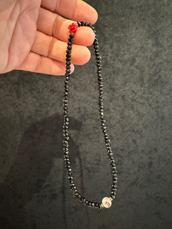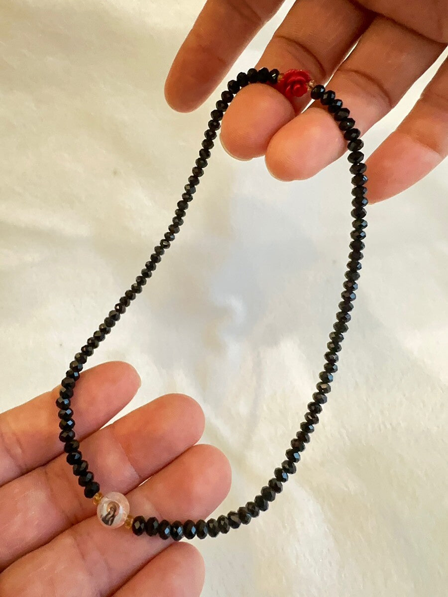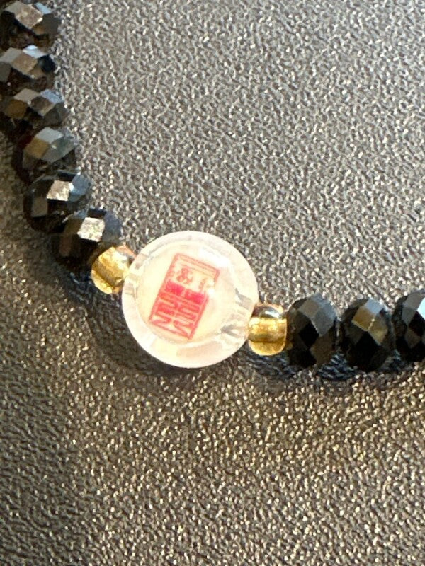 厄年の方、不運続きの方、心配事が多い方へ。心を守護し、幸福と癒しをもたらす強力なお守りです。フリーサイズ(伸縮性あり)、素材:オニキス、樹脂、赤珊瑚。
