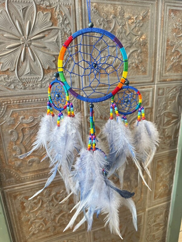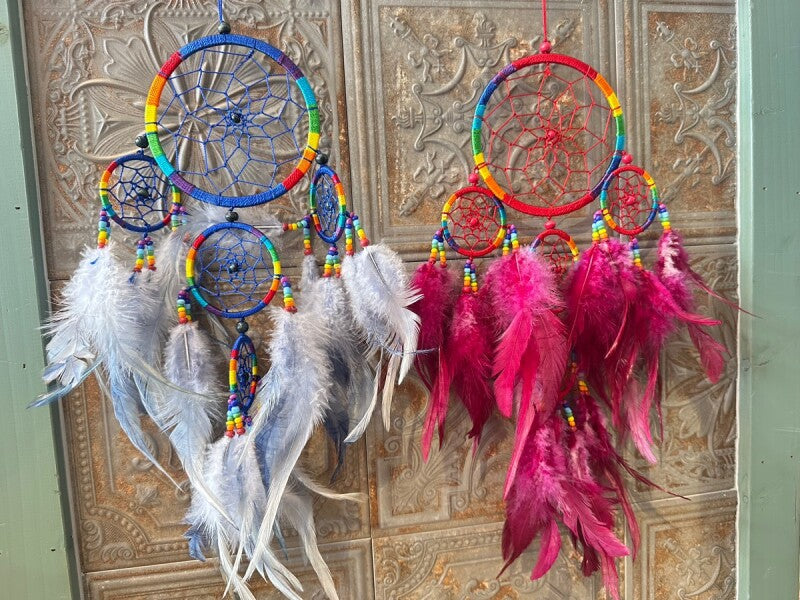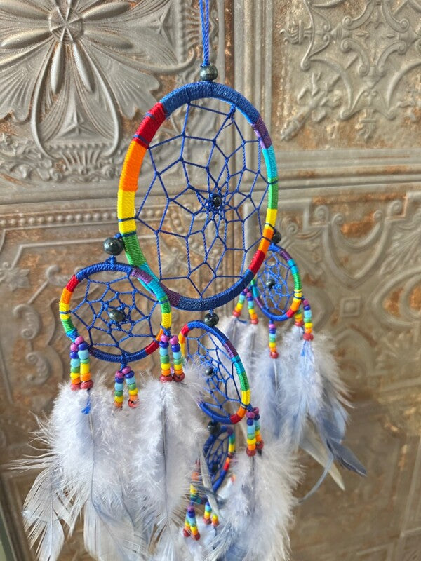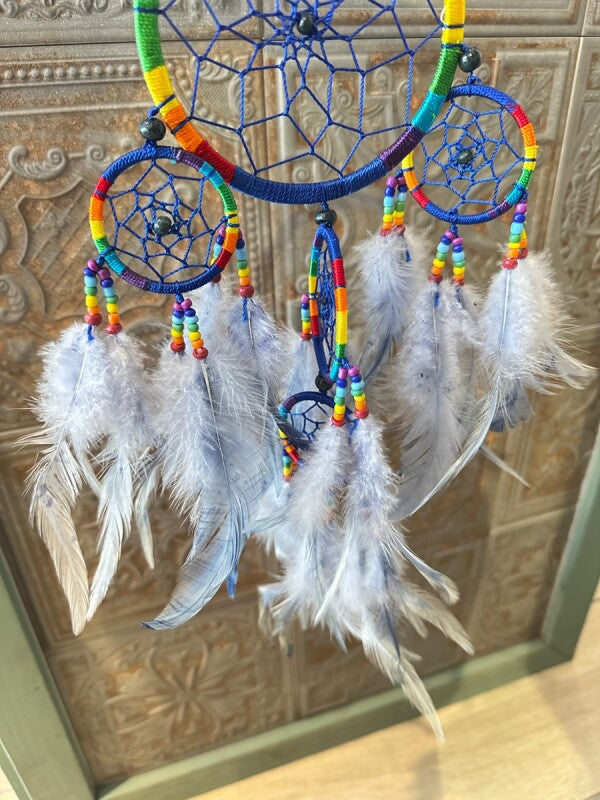 アメリカンインディアン、オジブワ族に伝わる神秘のお守り、ドリームキャッチャー。こちらは、目を引くレインボーカラーとふわふわの羽が特徴の、多連タイプです。大小合わせて5つのドリームキャッチャーが連なり、空間を華やかに彩ります。