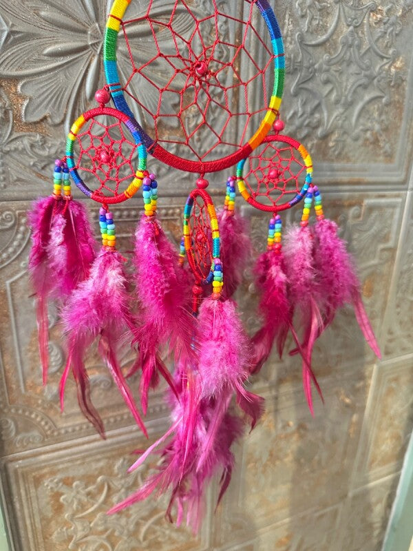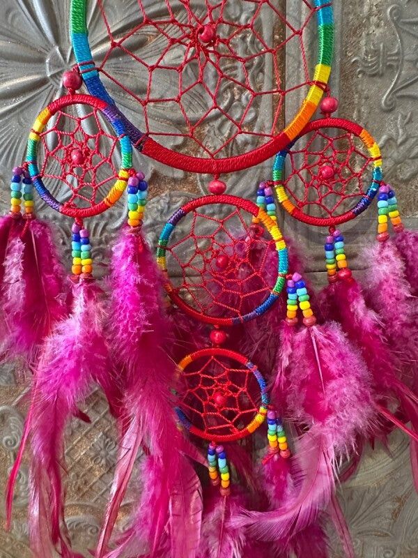 アメリカンインディアン、オジブワ族に伝わる神秘のお守り、ドリームキャッチャー。こちらは、目を引くレインボーカラーとふわふわの羽が特徴の、多連タイプです。大小合わせて5つのドリームキャッチャーが連なり、空間を華やかに彩ります。