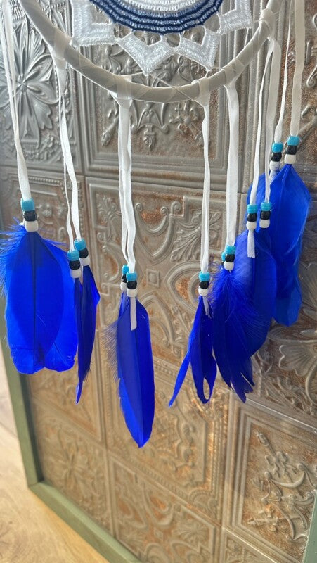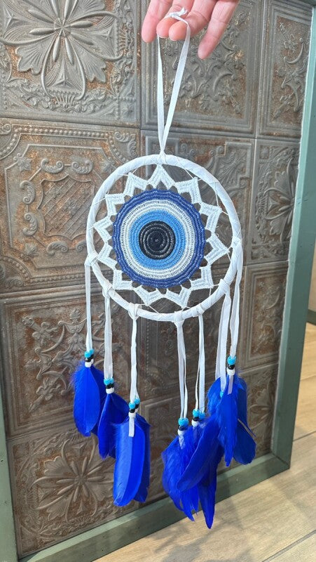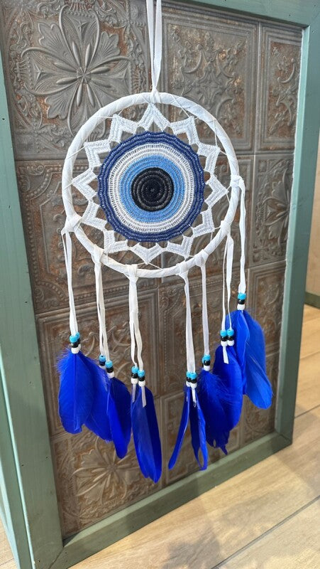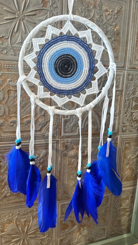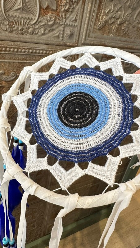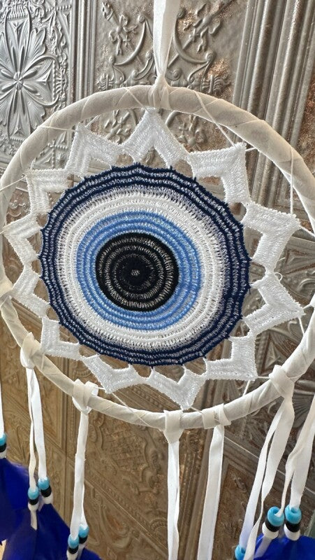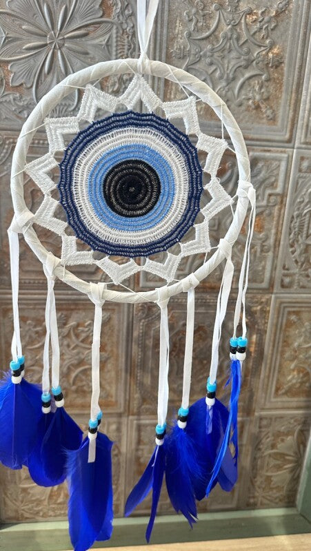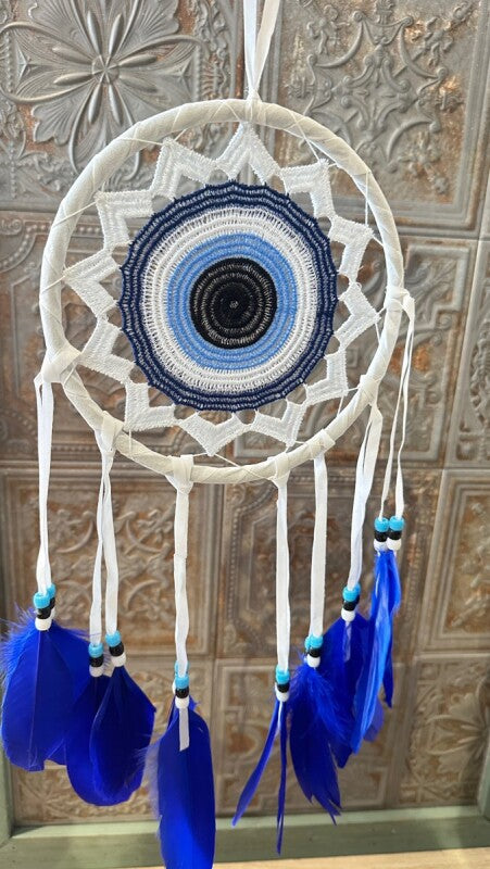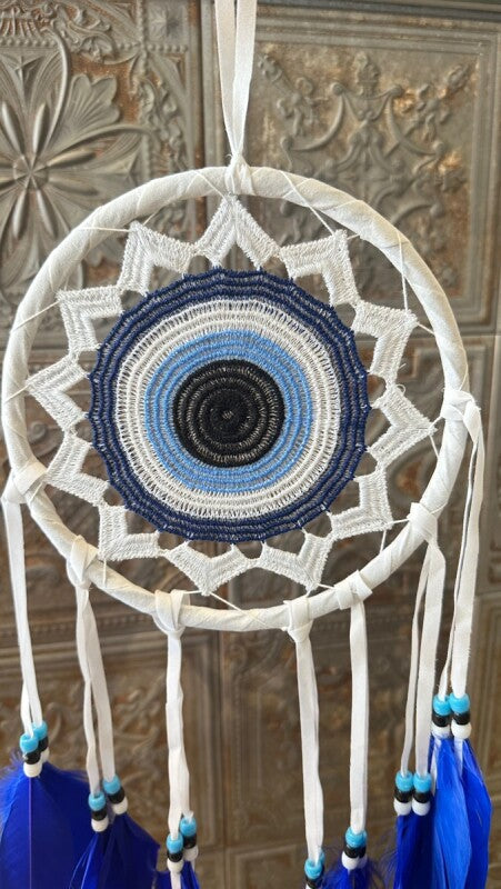 アメリカンインディアン、オジブワ族に伝わる神秘のお守り、ドリームキャッチャー。こちらは、トルコに古くから伝わる魔除けのお守り、ナザールボンジュウをモチーフにした特別なデザインです。目玉が邪視を跳ね返すとされるナザールボンジュウの力が加わり、より強力な災い除けのお守りとなりました。