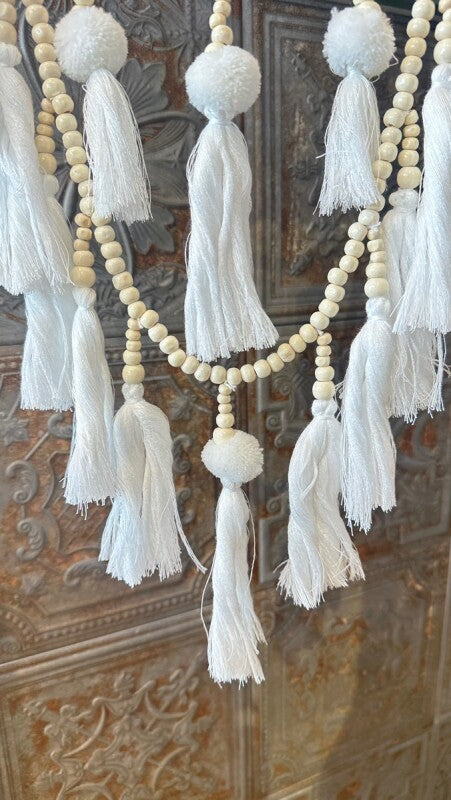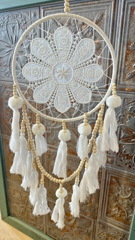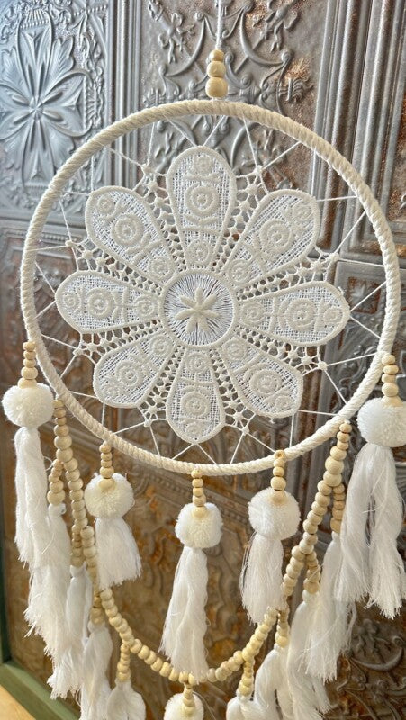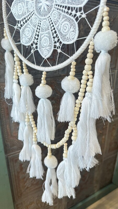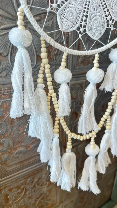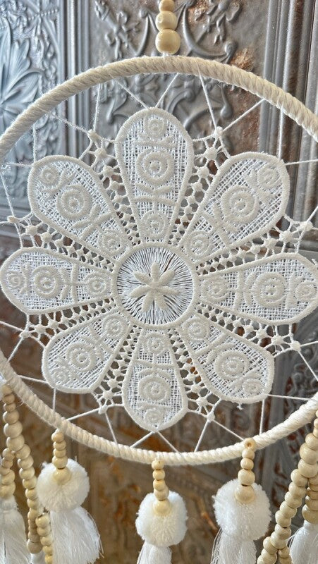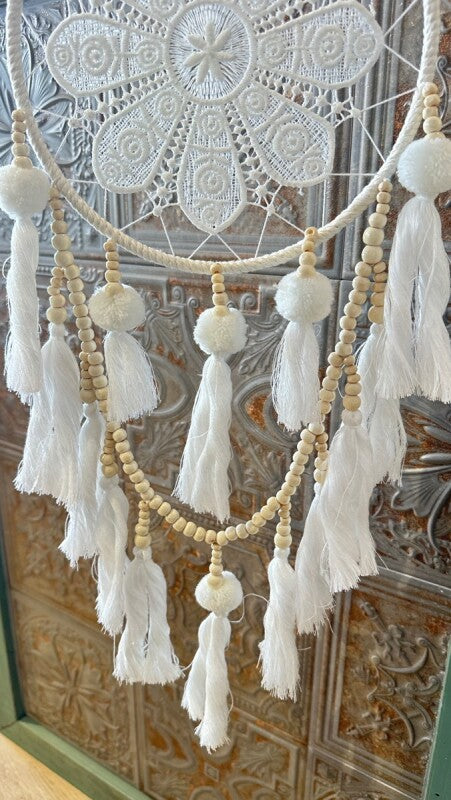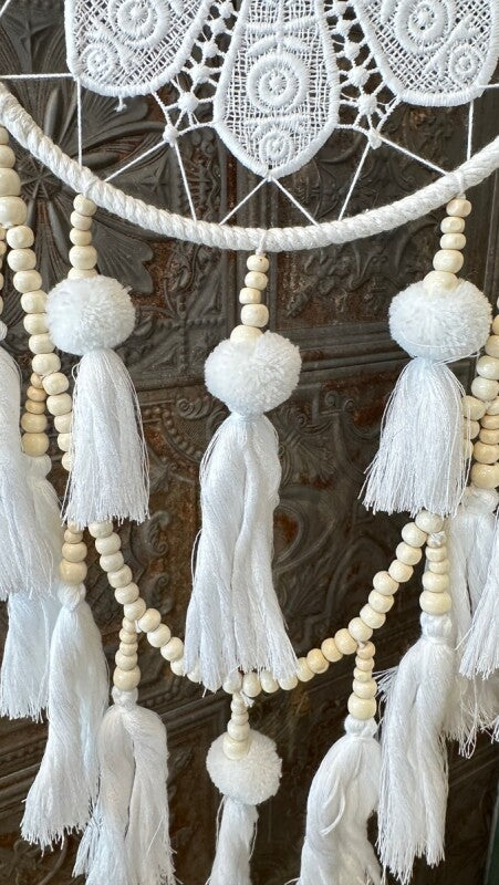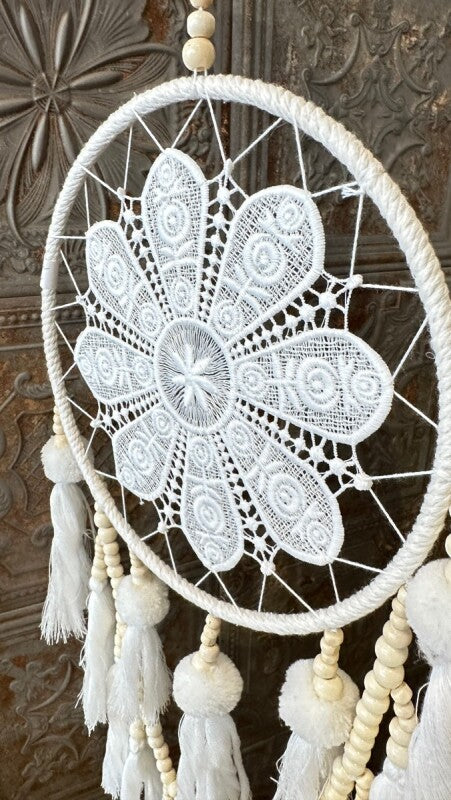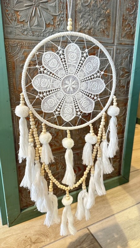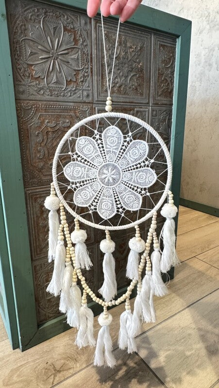 アメリカンインディアン、オジブワ族に伝わるお守り、ドリームキャッチャー。こちらは花のような繊細なレース編み(マクラメ)が美しい、北欧インテリア風のデザインです。オフホワイトとアイボリーで統一されたカラーは、フェルトボールとビーズ、編み込みのタッセルと相まって、ナチュラルで柔らかい印象を与えます。