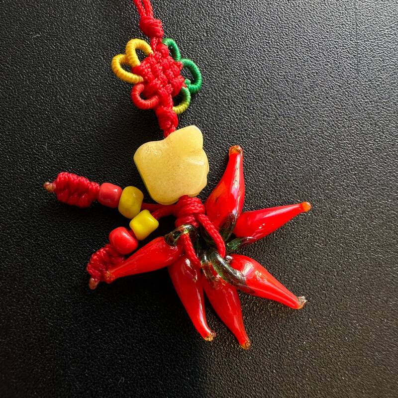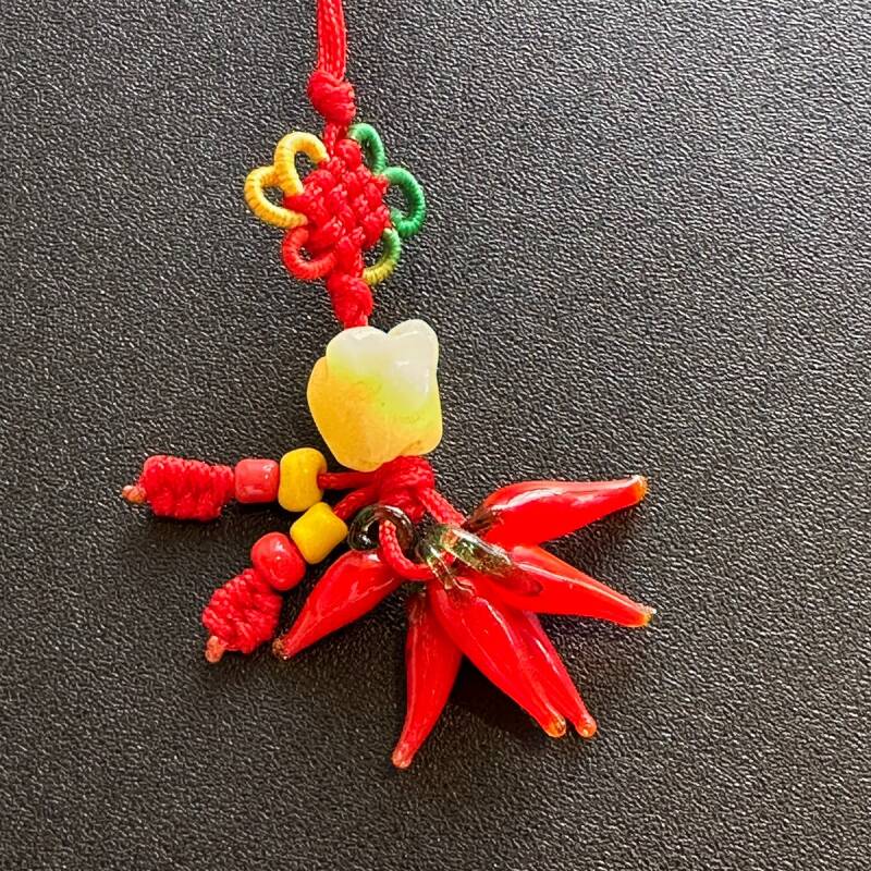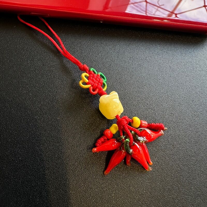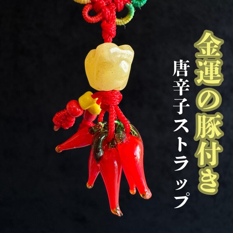 小さめのガラス唐辛子がたっぷりついたおしゃれなデザインで、金運アップの豚さんが付いた、厄を落とし幸運を呼ぶ強力なお守りです。